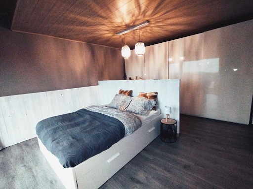Chambre spacieuse possédant de grands rangements. Le lit 160cm est en face d’un baie vitrée offrant une très belle vue sur les champs et forêts.